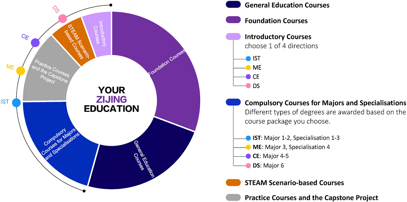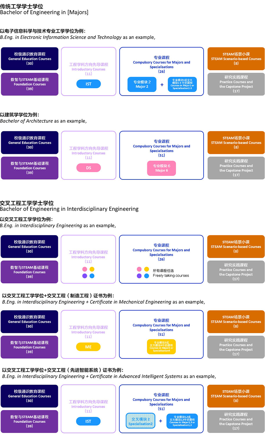 Upon meeting requirements for 1) General Education Courses, 2) Foundation Courses, 3) Introductory Courses, 5) STEAM Scenario-based Courses, and 6) Practice Courses and the Capstone Project, students will be awarded different types of degrees based on their selected courses and/or course packages from 4) Compulsory Courses for Majors and Specialisations: